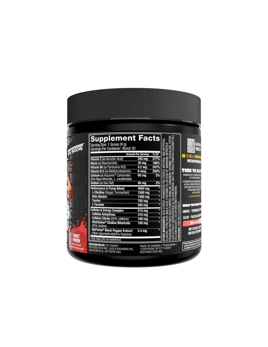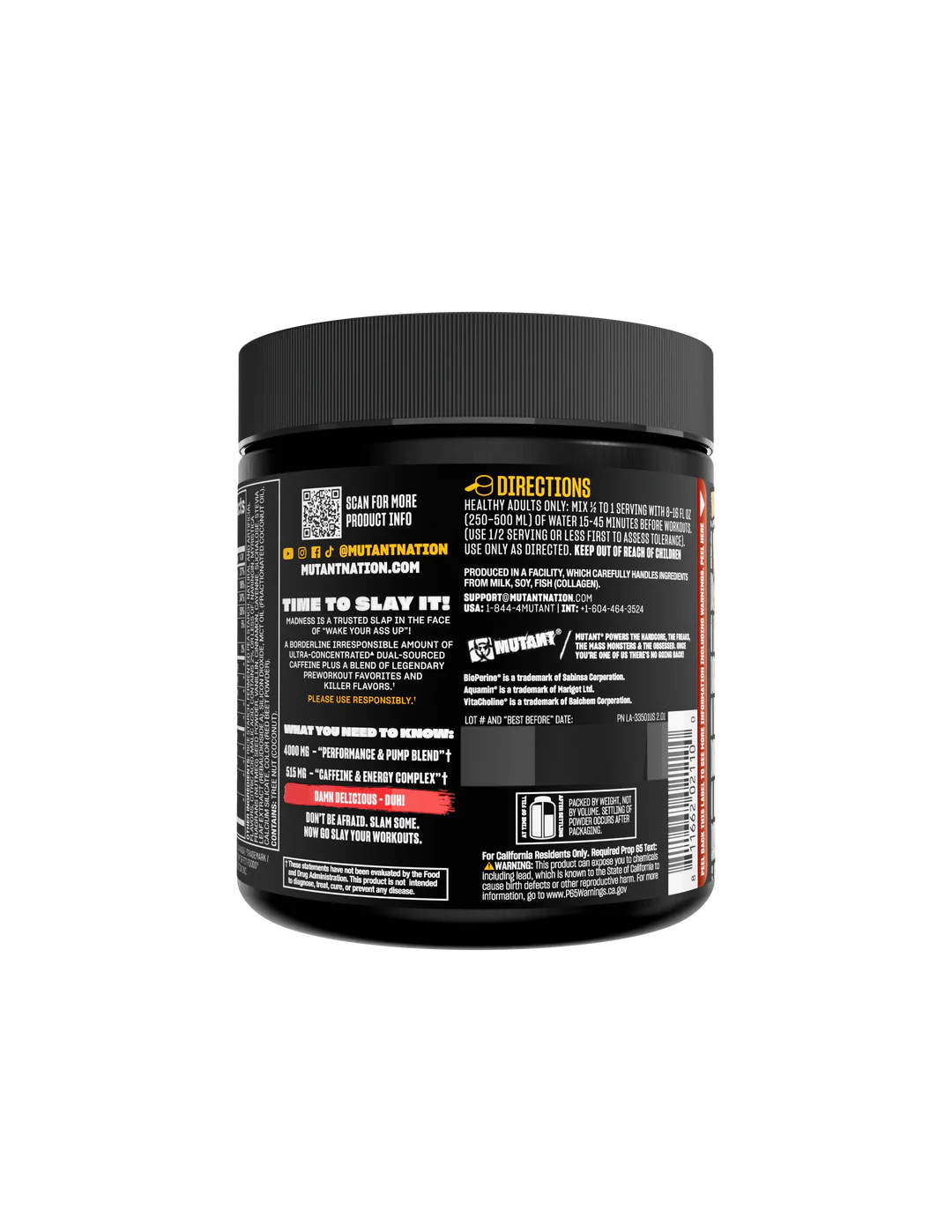 Madness is a trusted slap in the face of “wake your ass up”! This pre-workout has borderline irresponsible amounts of ultra-concentrated dual-sourced caffeine plus a blend of L-Citrulline Beta-Alanine, Taurine, neuro-helping L-Tyrosine & Vitacholine®, B Vitamins, and the boss nutrient delivery driver BioPerine®.†